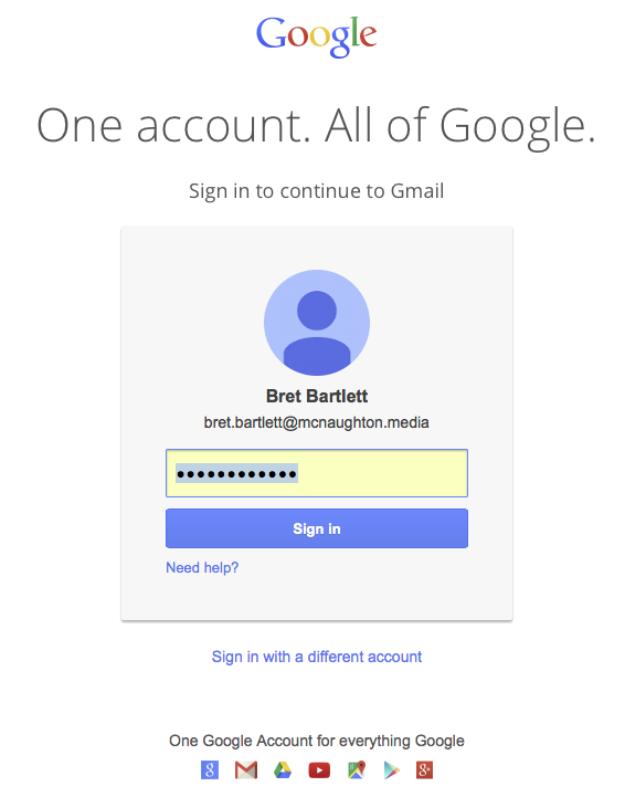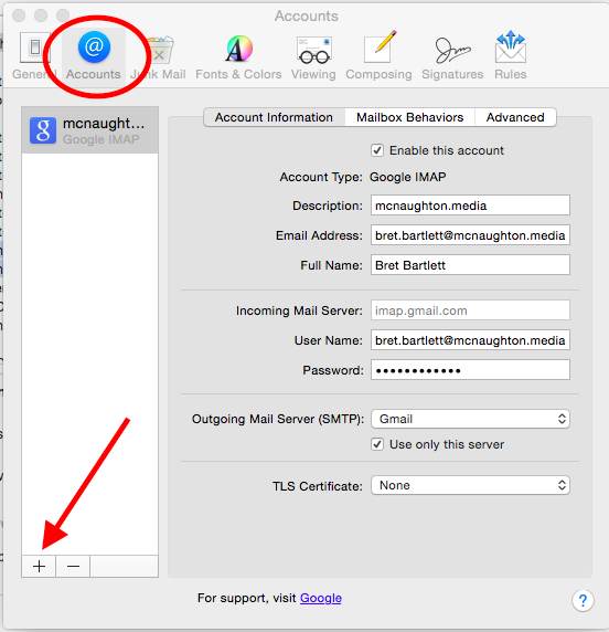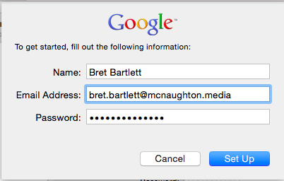 This document will assist you in adding your @mcnaughton.media Gmail account to your Mac Mail desktop client. This document applies to new Mac OS X installs (OS 10.7 and later.) In order to complete the steps in this document, you will need to know your new @mcnaughton.media e-mail address, which has the format of first.last@mcnaughton.media. You will also need to know your password for this account. If you don't have either of those things before beginning, please submit a request at help@mcnaughton.media to obtain your new account information.