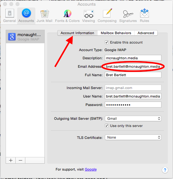 Once your account is setup, go back to the Mail | Preferences menu and select the "Accounts" tab again. Select your new Gmail account and click on the Account Information tab. In "Email Address" box, change the address from your @mcnaughton.media address back to your actual e-mail address that contains your site name (ie. davisenterprise.net, dailyrepublic.net, mtdemocrat.net.) Be sure NOT to change your "User Name" in the area directly below your e-mail address and full name. The user name must remain as your @mcnaughton.media account.