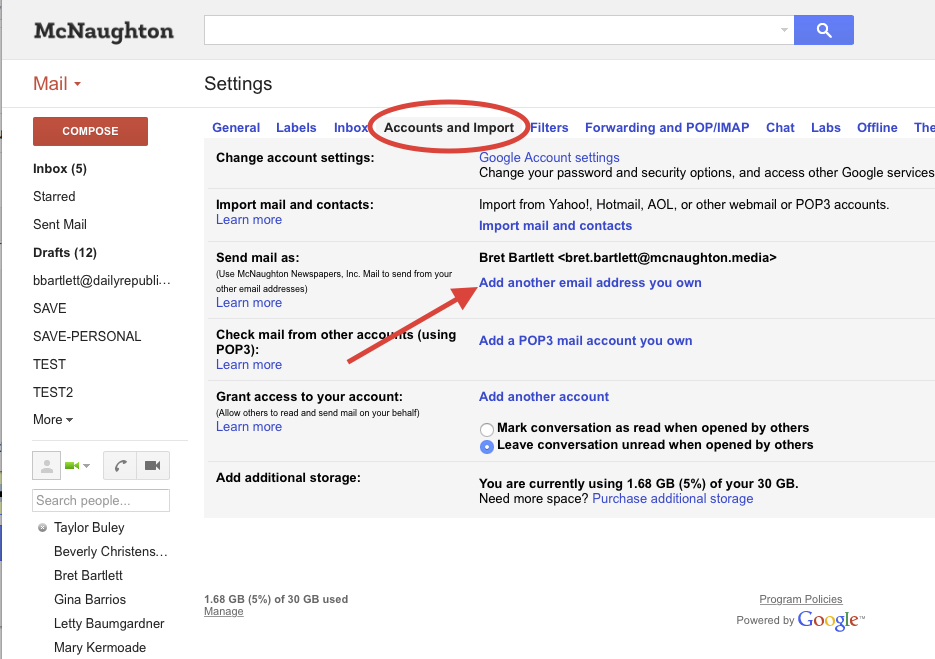 Then click on "Accounts and Import" as shown below, and click on "Add another e-mail address you own."