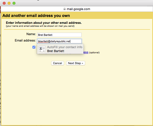 Once that it done, click "Next Step" and select "make default." Make sure that the "Always reply from default address" button is marked in the area directly below where you just added your e-mail address.