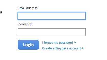 This will ask for the email and password you use for your TinyPass account. Since you'd like to reset your password, click "I forgot my password" and provide your email address to reset.