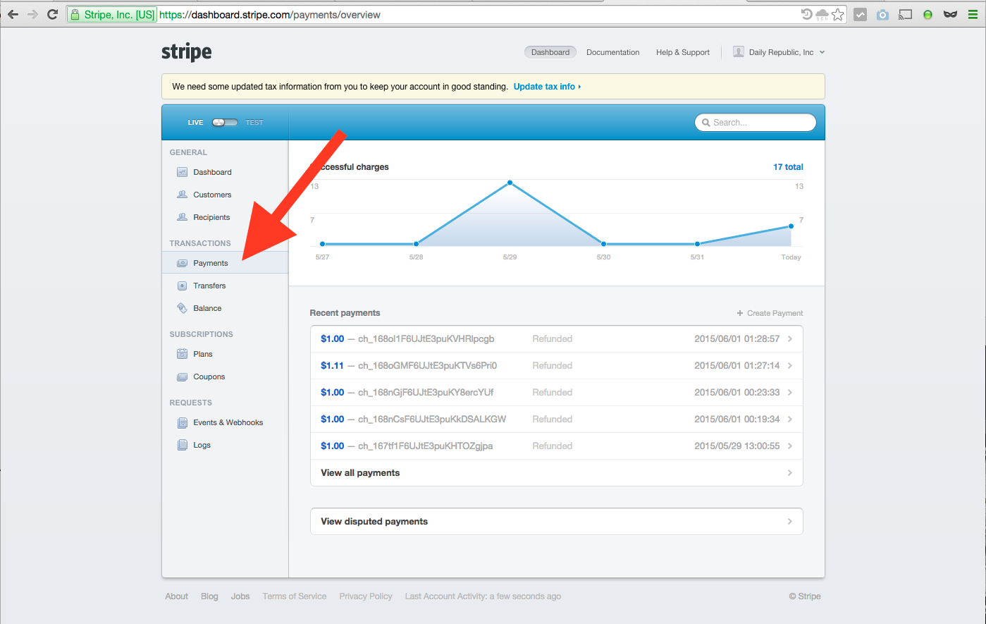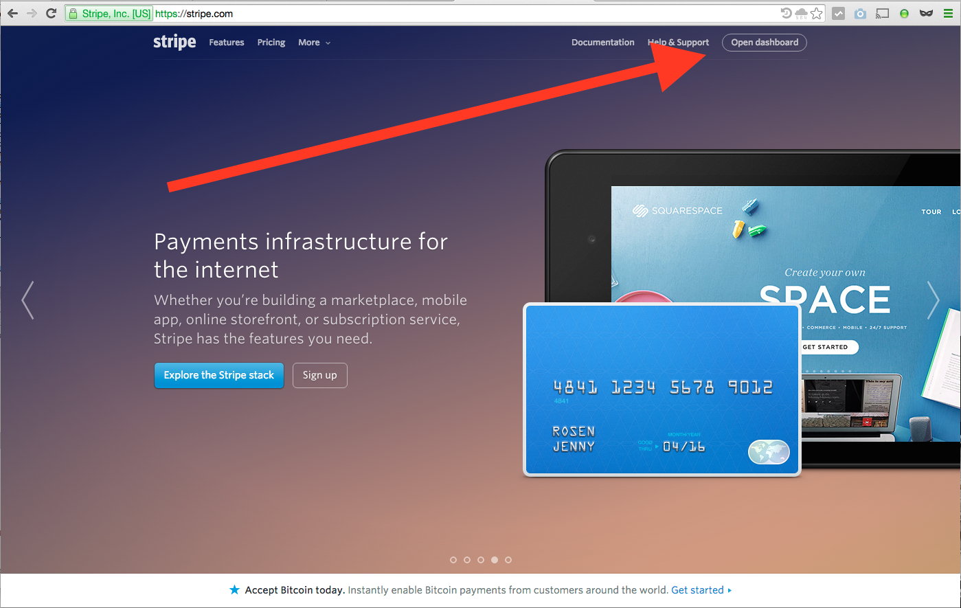 - visit http://www.stripe.com and click the "Open Dashboard" link (see below for where this exists on the page)