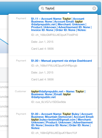 The Search box, which appears in the top right of the Stripe Dashboard, searches both Payments and Customers. Typing gives you "live" results, as seen immediately below. hitting enter will take you to a full results page for deeper search.