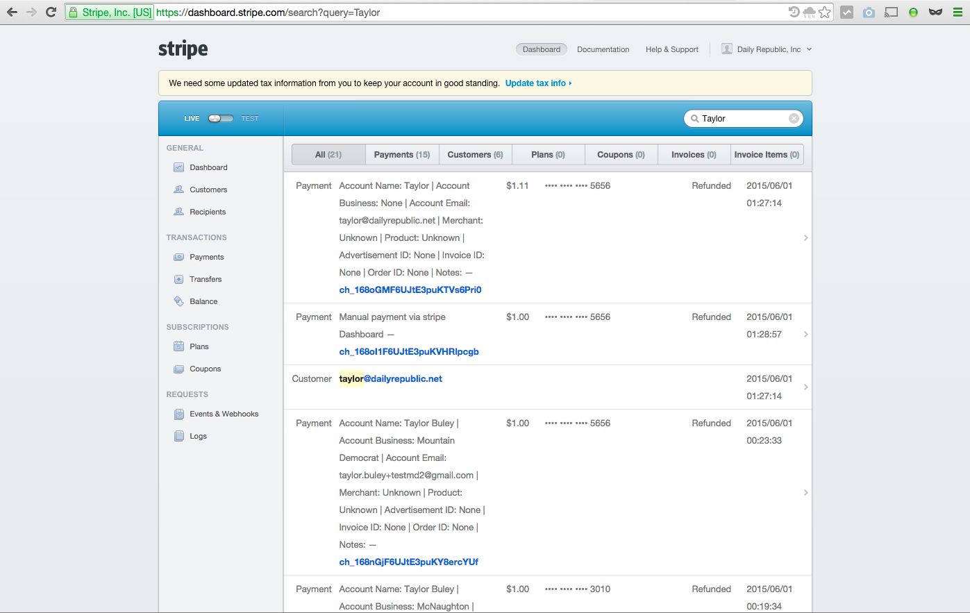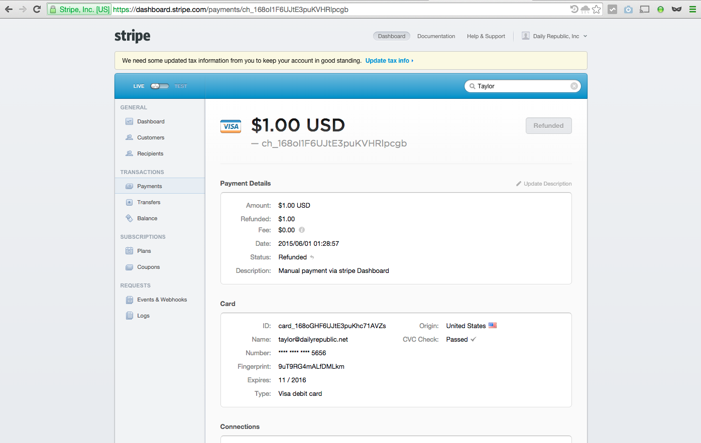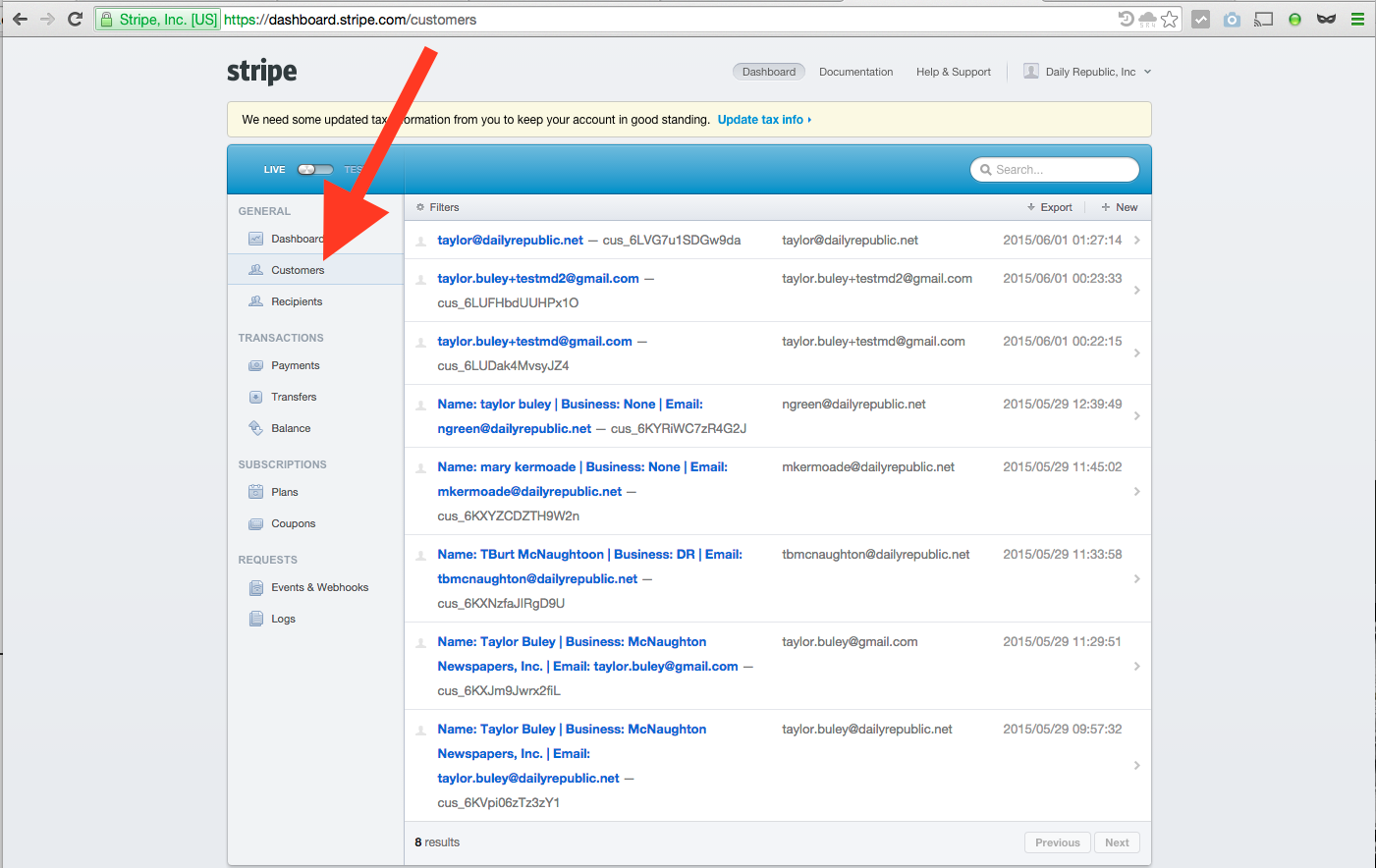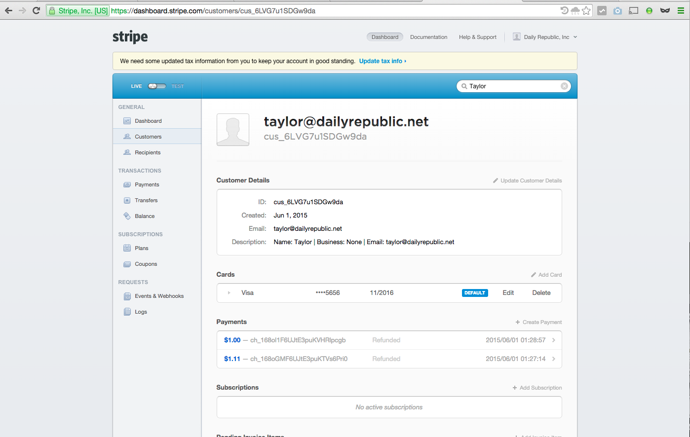 The Customers tab of the Stripe Dashboard lists our customers. If you click on an item, you'll see an individual customer record like the one below. This is where a customer's previous transactions are listed. See How Do I Look Up A Customer Record? and How Do I Look Up A Payment? for more information.