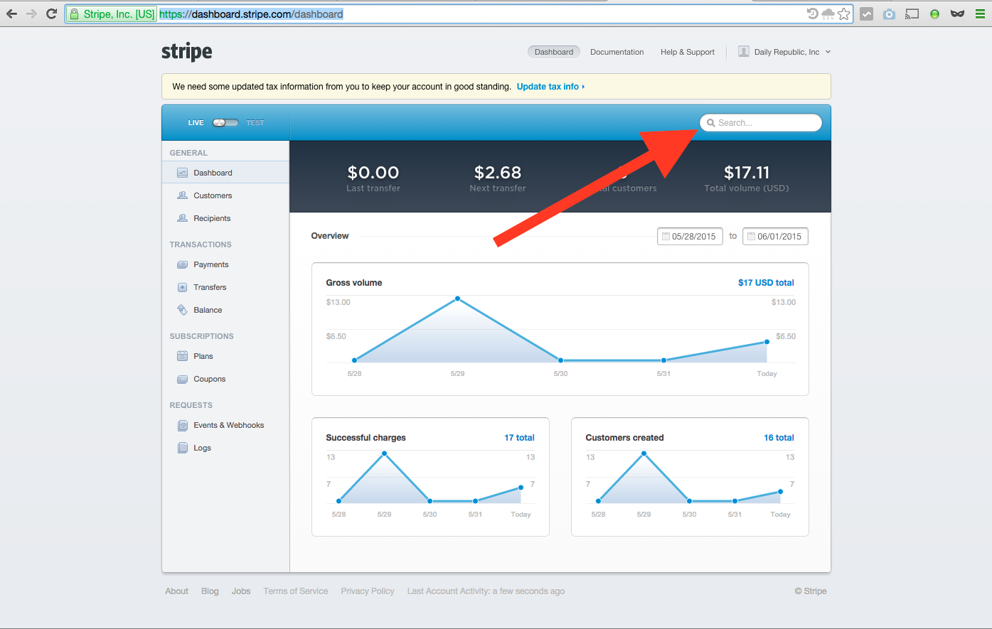 There are two main dashboard views we care about: Customers (https://dashboard.stripe.com/customers) and Payments (https://dashboard.stripe.com/payments/overview).