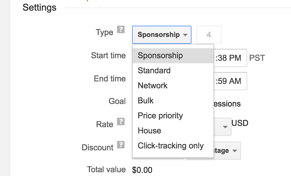 NOTE: If you are creating a House ad, your ad *must* be set to House. The other ones we use are Standard (usually) and Sponsorship (rarely). Use the dropdown pictured below.