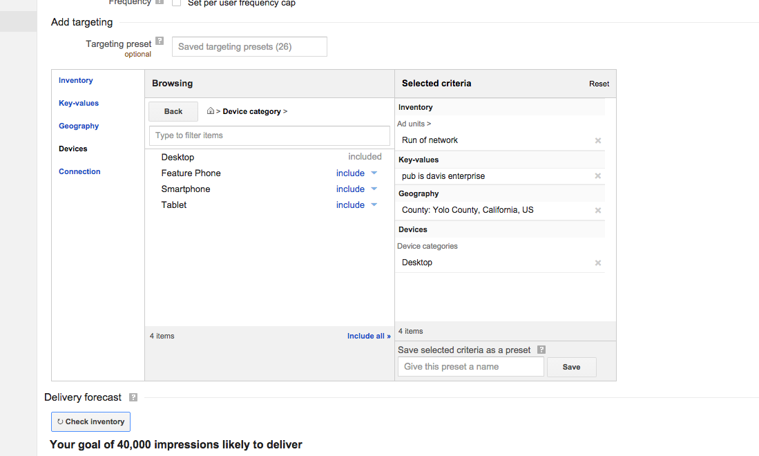 A targeting visual is below. Each blue link on the left represents a panel. Here are a couple targeting hints: 1) Geotargeting happens in the Geography tab 2) To target a publication, use "key-values" panel with "pub" as the key and the name of the publication (e.g. "Davis Enterprise") as the value. Content targeting uses the "cat" key with the name of the section (e.g. "Living") as the value.