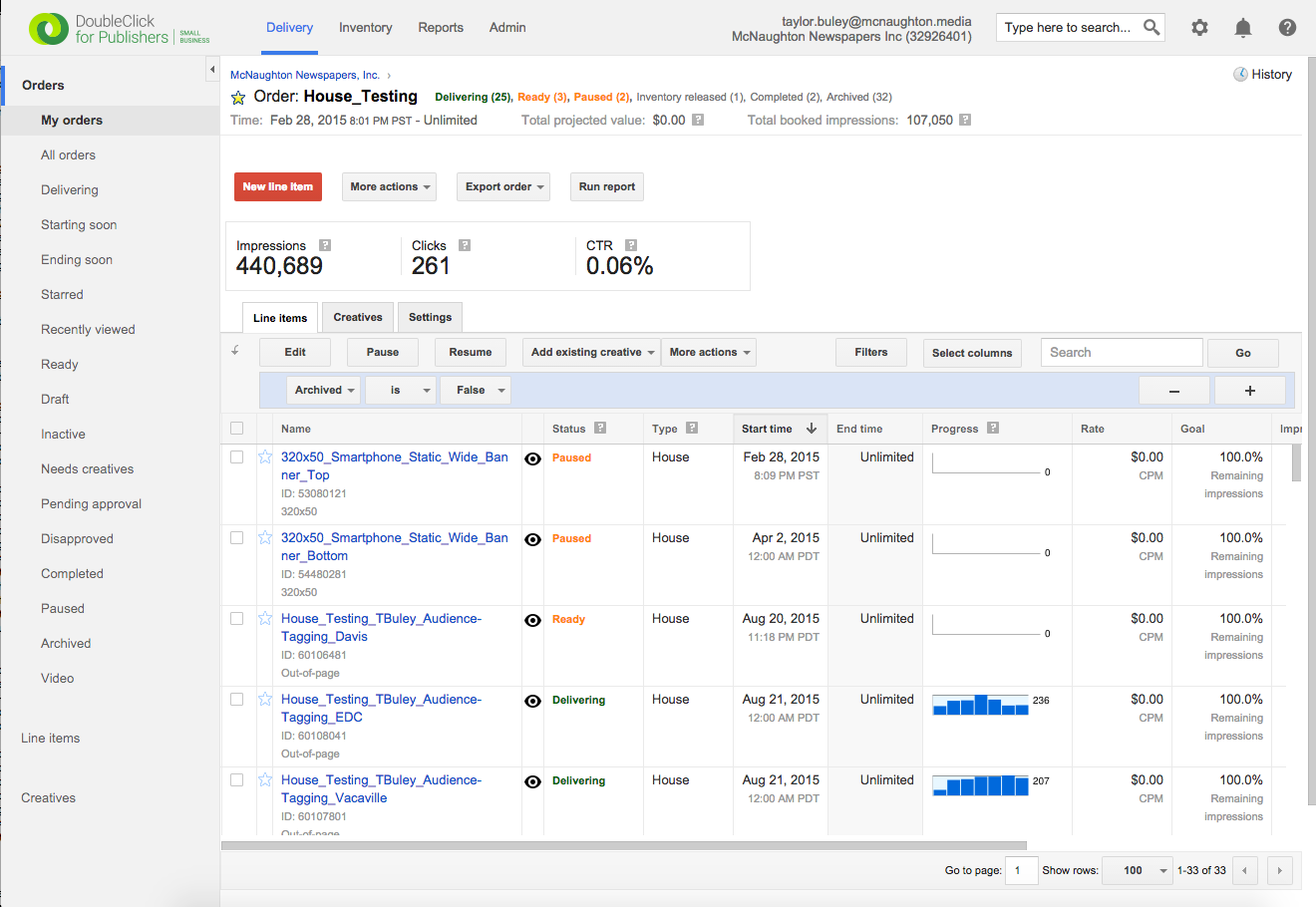 Note the "Status" of the Line Item for more information about what you need to do next. "Draft" means it needs to be booked and submitted for review. "Needs Creatives" means you'll need to attach creatives for each size you've specified. Follow up with How Do I Add Creatives To A Line Item? to attach a creative to your new line item to enable it to go live.
