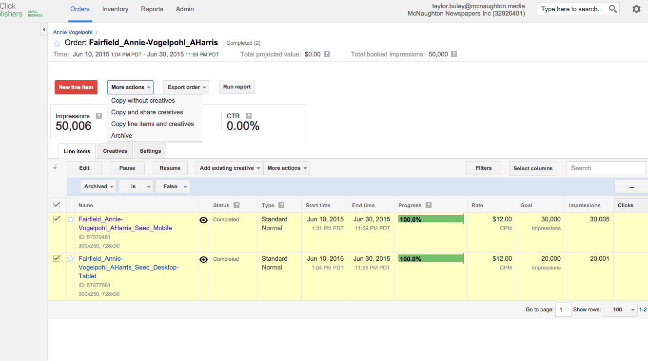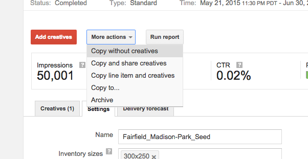 Step 1: Under the "More actions" button choose "Copy line items and share creatives." Choose instead "Copy line item and creatives" if you think you may modify the creatives later.