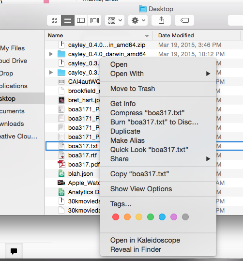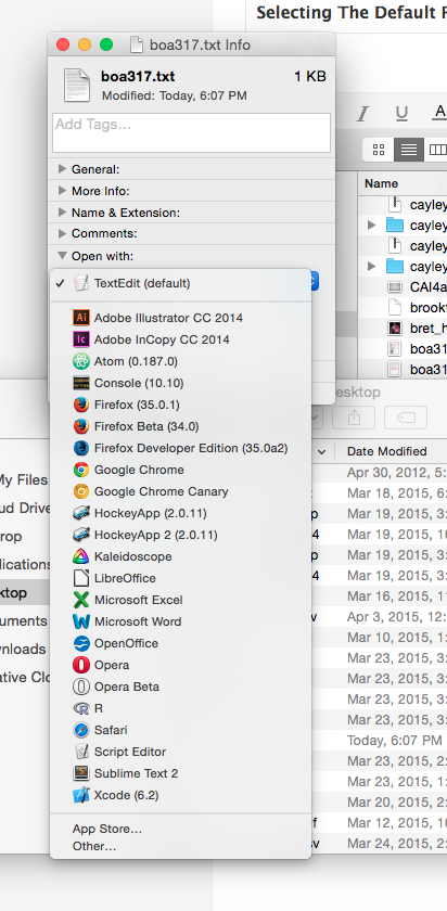 Control+Click the file for which you'd like to set the default program and choose "Get Info" from the list. You can either set the program for this one file or for all files of its type. For example, clicking to the "Get Info" panel for example.txt can change the default program to open either all .txt files or just example.txt.