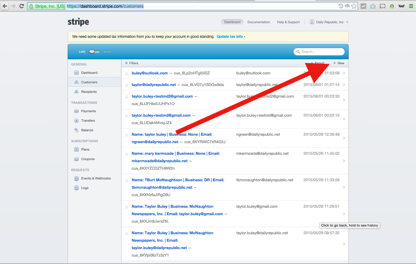 Using the Payment Form (yourpublication.com/pay e.g. www.dailyrepublic.com/pay) is a quick way to create a new Customer Record if one doesn't exist. Using the provided email required by this form, it uniquely identifies Customer Records and associates the payment with the right Customer Record, as visible via the Stripe Dashboard. Information on how to use this form can be found in What Is The Payment Form?
