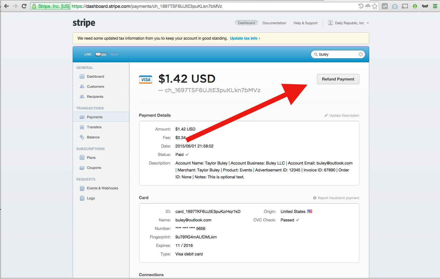 Step 2: Click the "Refund Payment" button (red arrow)