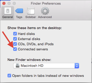 This document will show you how to dump the old "DR" drive and add it back to your desktop connecting using SMB. It will also show you how to add that newly connected SMB drive to the startup items of your user. This article assumes that you have the network drive visible on your desktop. If you don't see your network drives on your desktop, go to the Finder menu and select Preferences. Then click the checkbox next to "Connected servers.