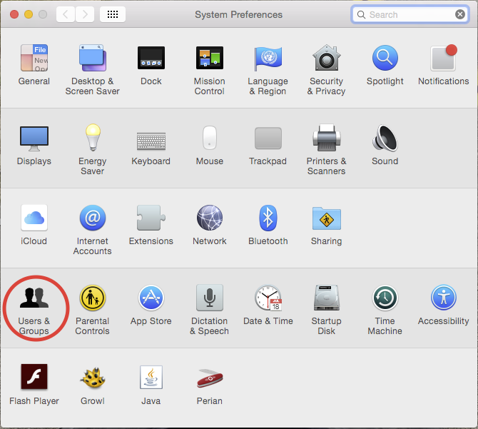 Once you have connected to the new server using SMB, open Systems Preferences and click on Users and Groups