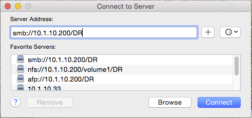 First, drag the old AFP connected "DR" drive to the trash. Then go to the finder menu and select "go" and "Connect to server...." Type "smb://10.1.10.200/DR" in the "server address" box and hit the + sign to add it to your favorite servers. Then click "connect" to connect to the new server using SMB.