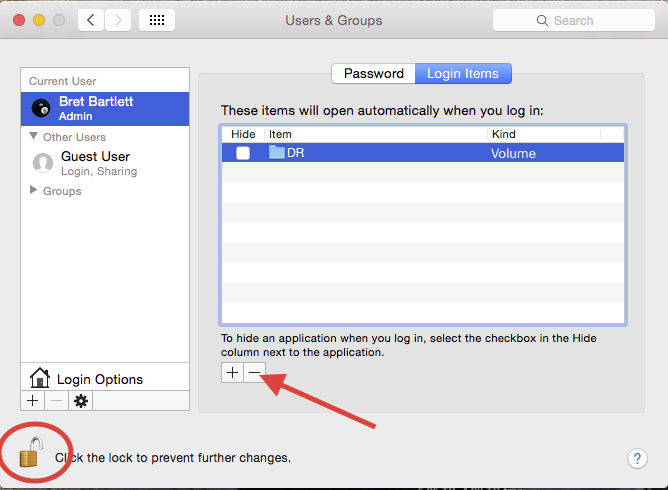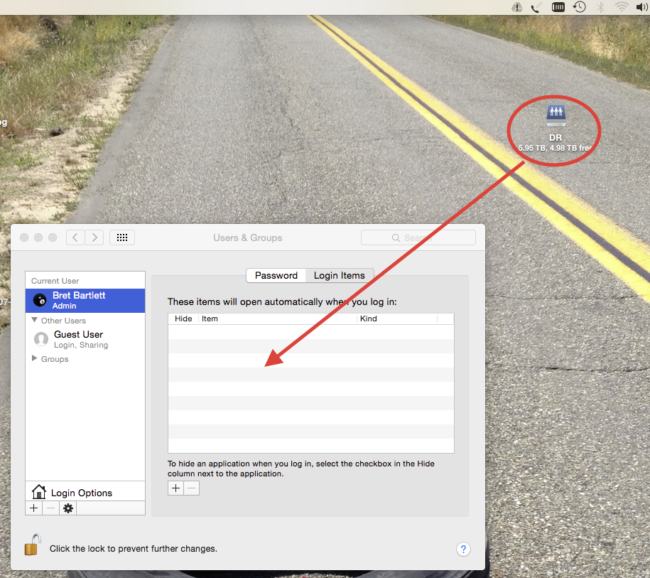 Next, drag the new drive from your desktop to the Login Items pane. This will set that drive to reconnect on login after each reboot. Close out the Users and Groups window and you are done.