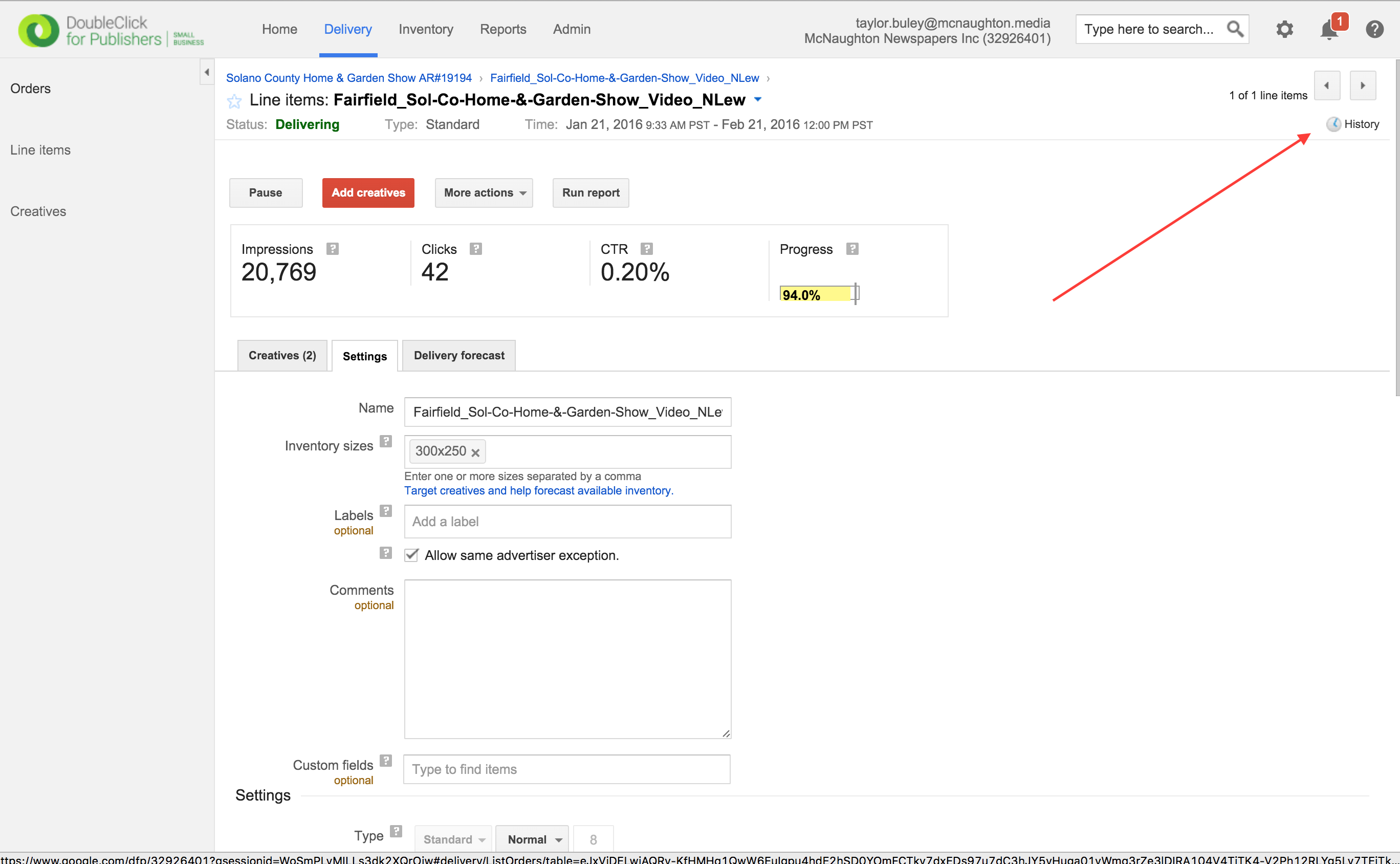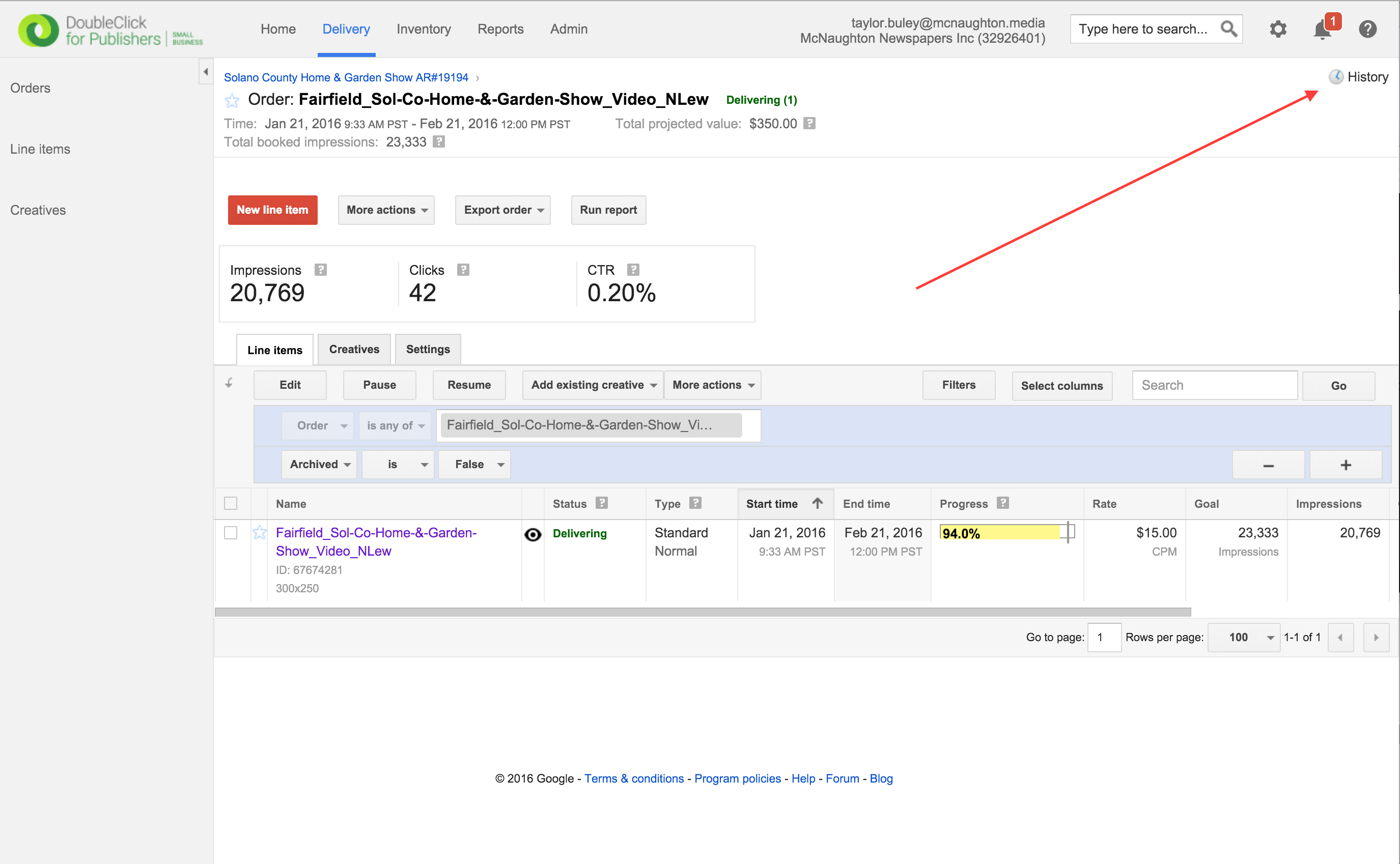 Step 0: From an Order (1st image below) or Line Item (2nd image below), click the "History" Link in the upper right-hand corner