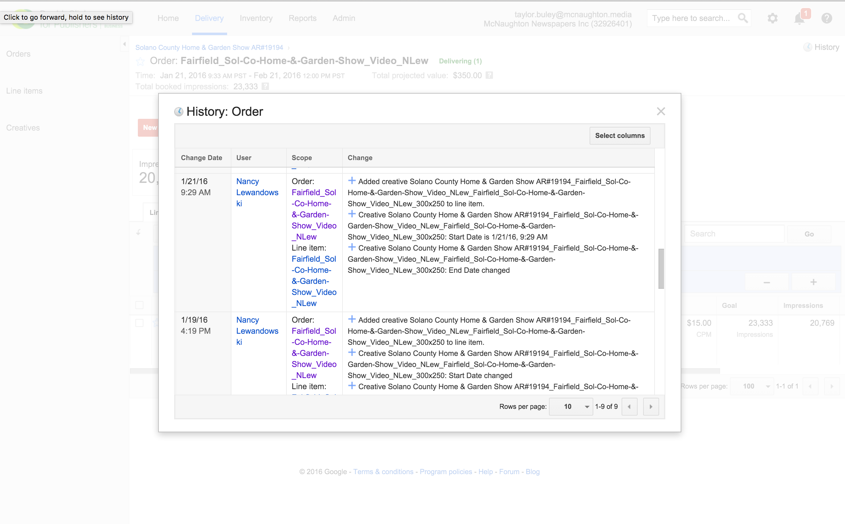 Most sales related users can see a "History" link that pops all changes to a Line Item or Order. If you can't see this, ask a DFP administrator about adding the right.