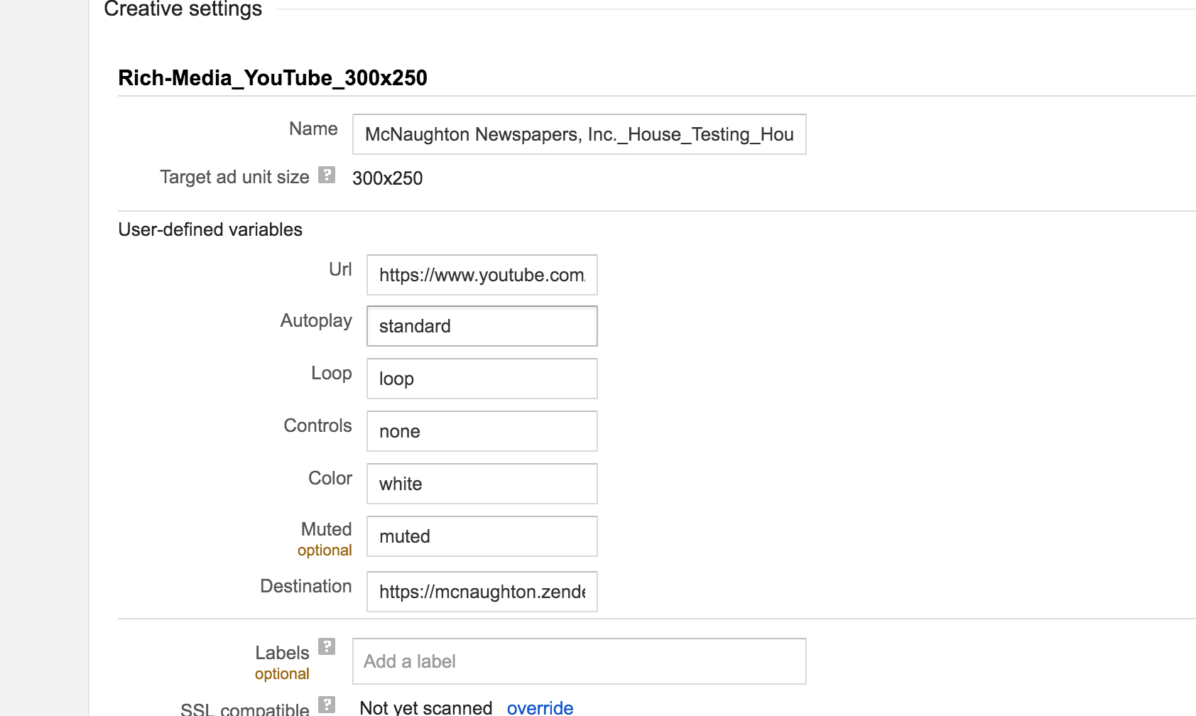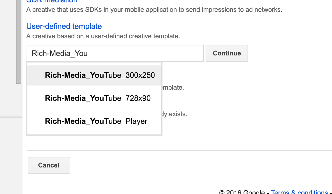 Step 2: On the "Creative: New creative" screen, scroll down and click "User defined templates" then type "Rich-Media_YouTube_300x250" or "Rich-Media_YouTube_728x90" depending on your size needs.