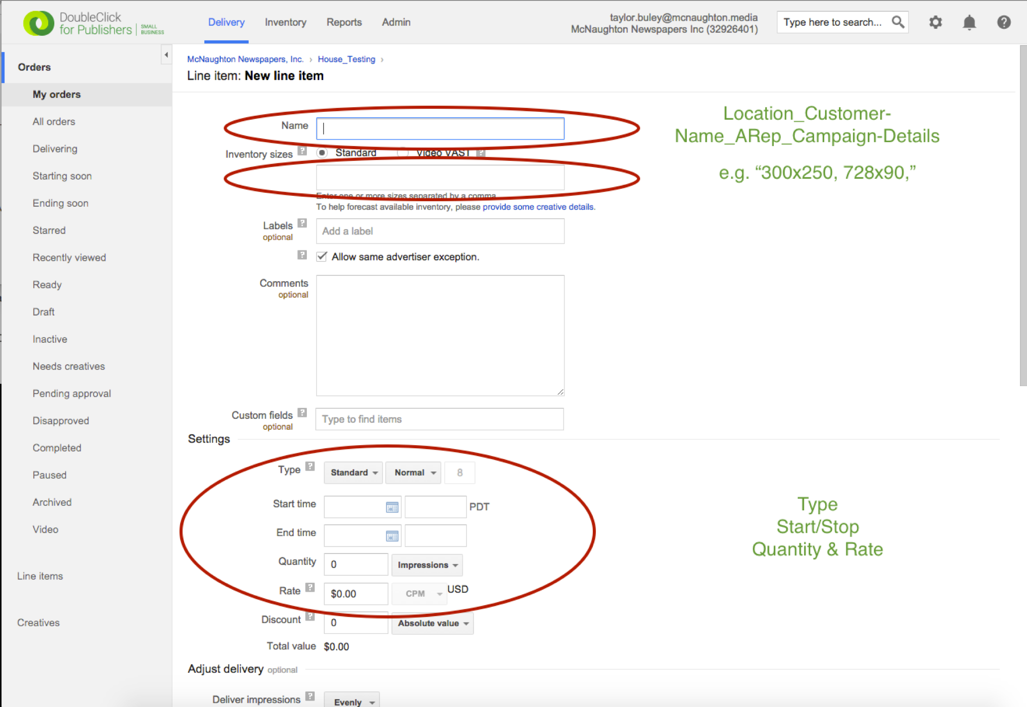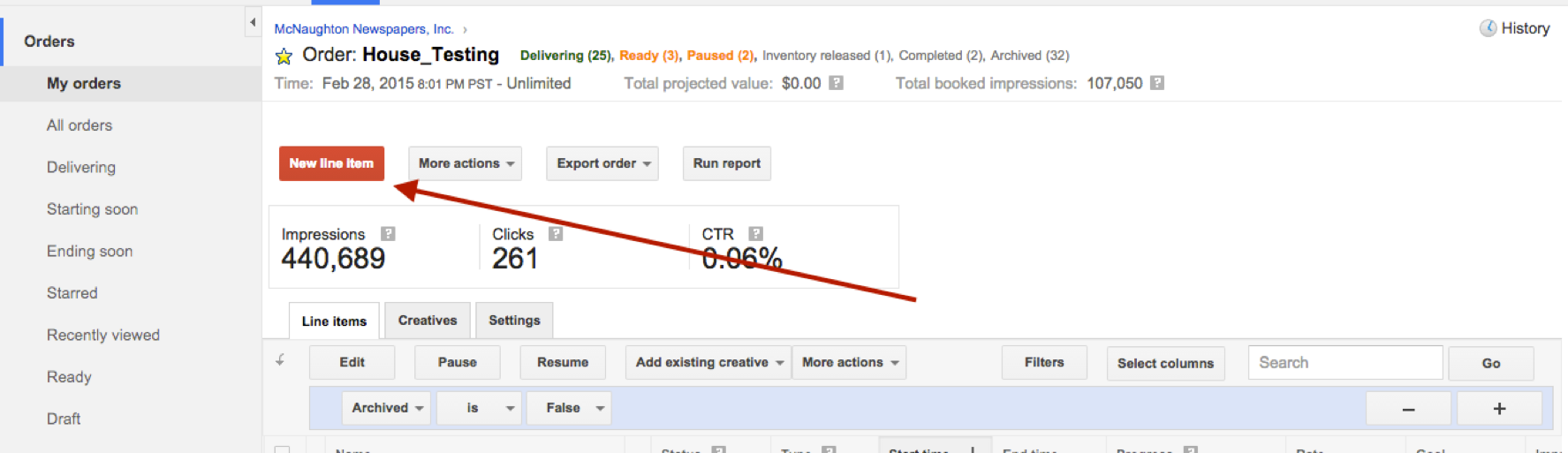 Note the "Status" of the Line Item for more information about what you need to do next. "Draft" means it needs to be booked and submitted for review. "Needs Creatives" means you'll need to attach creatives for each size you've specified. Follow up with How Do I Add Creatives To A Line Item? to attach a creative to your new line item to enable it to go live.