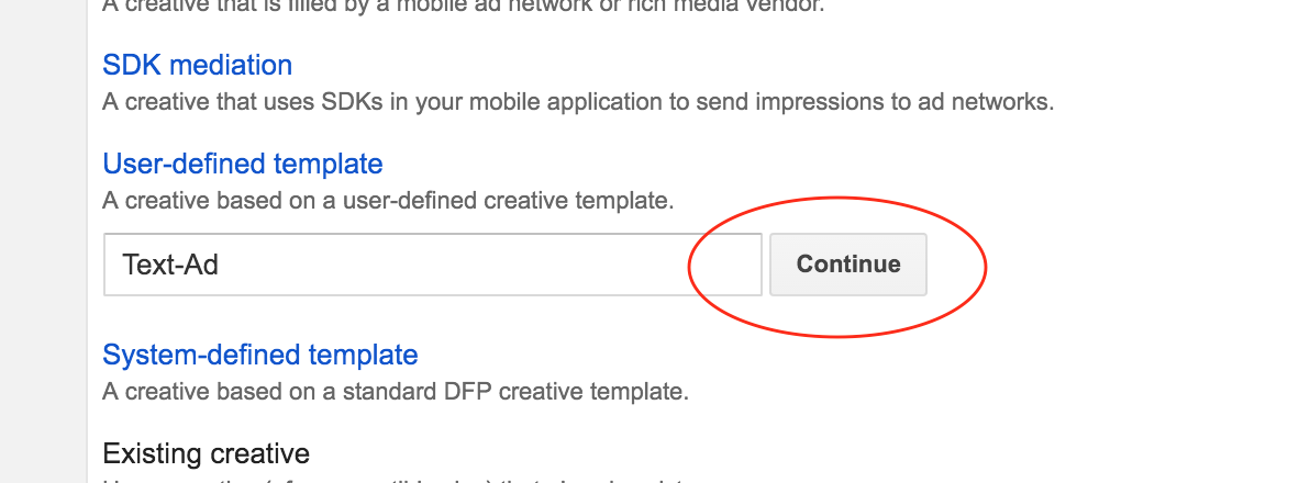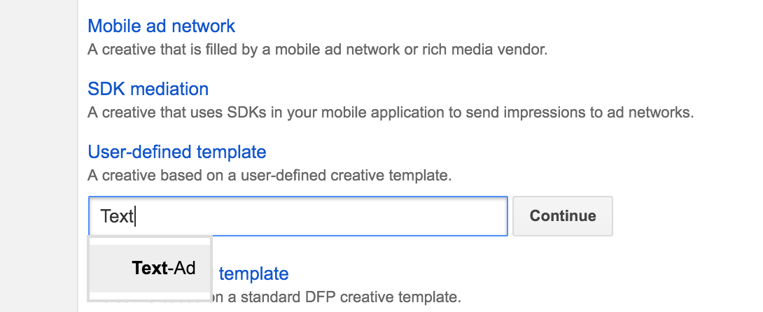 Step 1: From the creatives selection screen, go to the "User Defined Template" area and type "Text-Ad." This is our custom creative template for a text ad.